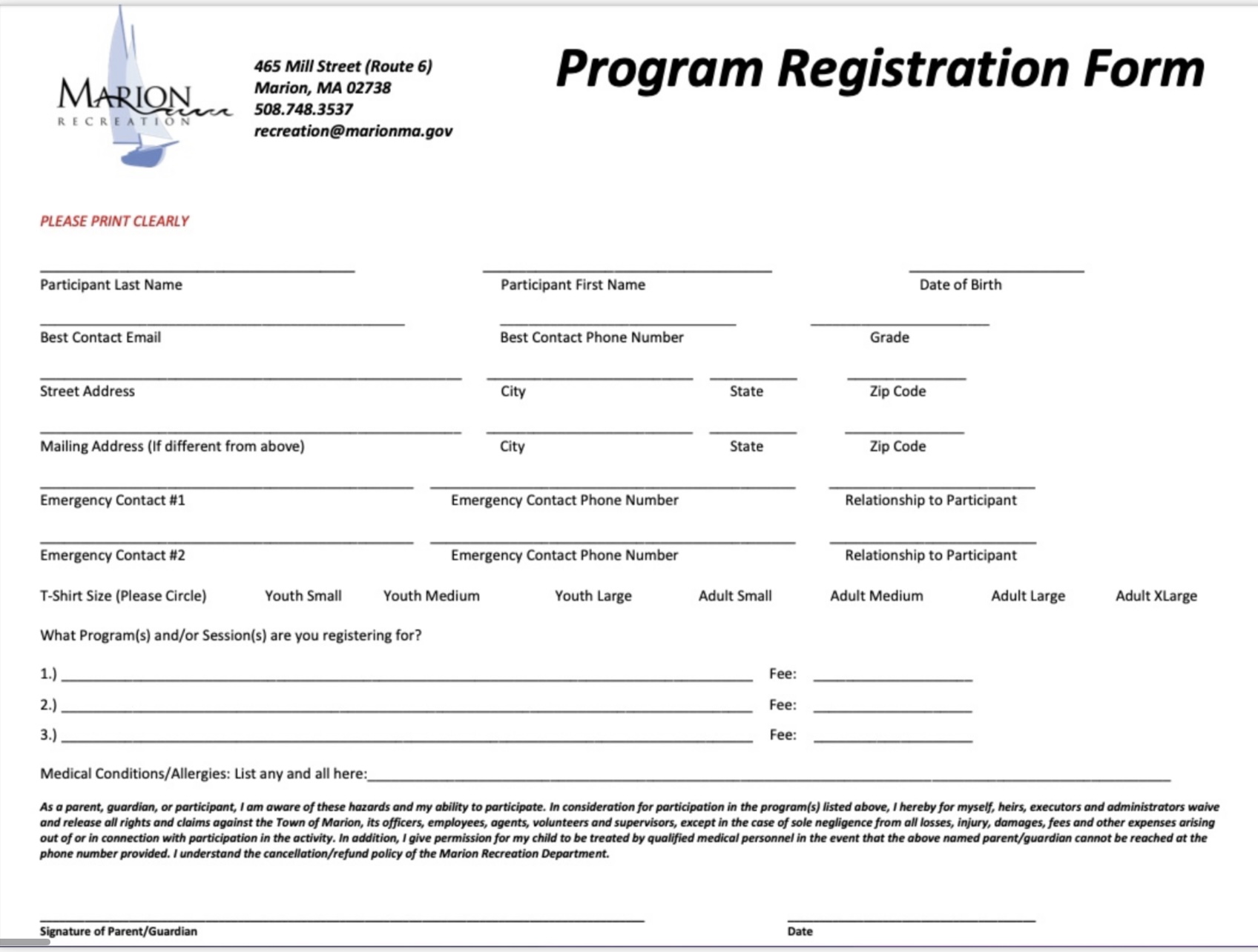 How To Register: Marion Recreation programs are available for online registration at https://unipaygold.unibank.com/default.aspx or by downloading and submitting a paper registration form. Mail or drop off the completed form with a check made out to Marion Recreation at the address 465 Mill St. Marion, MA 02738. For questions, please email alambert@marionma.gov or stavres@marionma.gov. Program registration is not complete until final payment is received. Program space is available on a first-come first served basis and online registration is preferred.